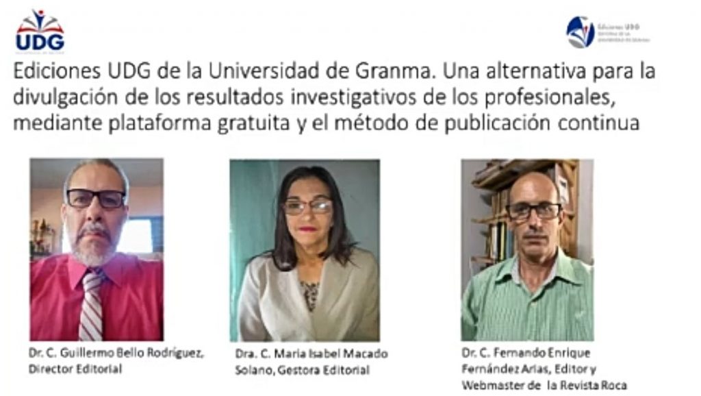 En su modalidad On-line, el taller inició con la Conferencia: “Ediciones UDG de la Universidad de Granma: una alternativa para la divulgación de los resultados investigativos de los profesionales, mediante plataforma gratuita y el método de publicación continua”, que fue impartida por prestigiosos especialistas de nuestra Casa de Altos Estudios, el Dr.C. Guillermo Bello Rodríguez, Director Editoria, la Dr.C. María Isabel Machado Solano, Gestora Editorial y el Dr.C. Fernando Fernández Arias, Editor y Webmaster de la Revista Roca.
