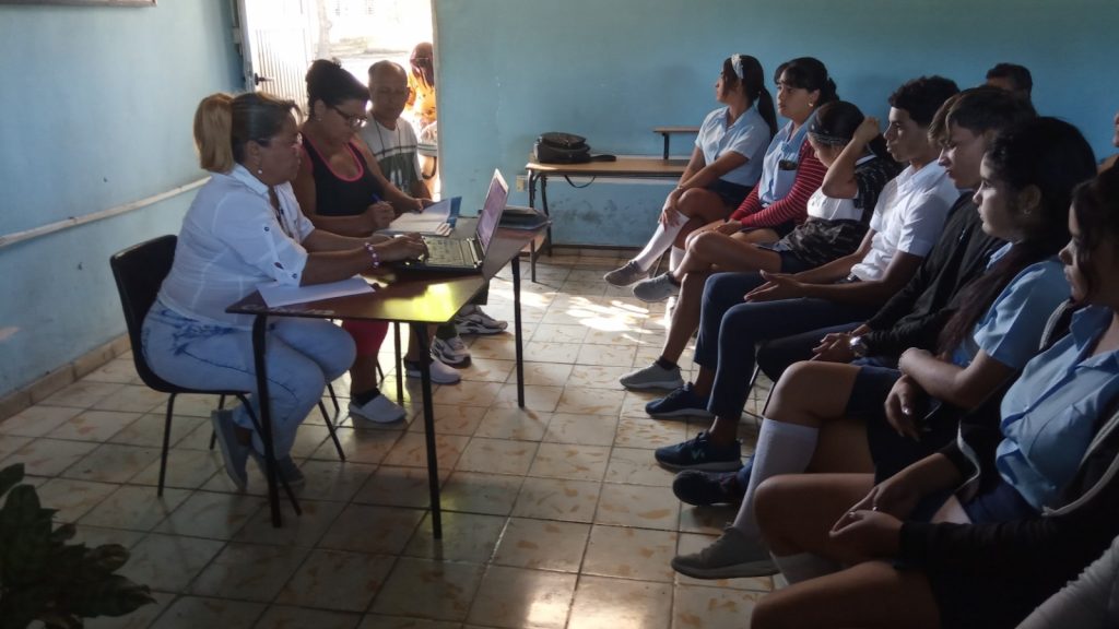 La Coordinadora Municipal del Colegio Universitario, MSc. Emilia Rosa Mesa Torres, profesora del CUM dio apertura a las actividades de Formación Vocacional y Orientación Profesional (FVOP). La acompañaron además miembros del Consejo de Dirección de Educación y de la institución. Entre ellos, el Lic. Félix León Díaz, Director; Lic María de los Ángeles Capote Pérez, Secretaria Docente y Lic Yanela Sosa Osorio, Responsable del CU en la institución.
